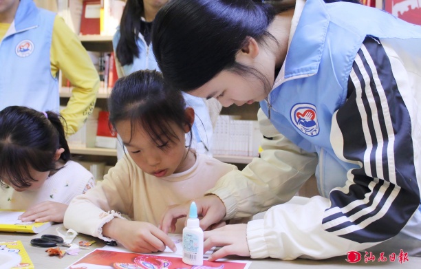 志愿隊(duì)隊(duì)員在指導(dǎo)小朋友拼接“魚(yú)鱗”。