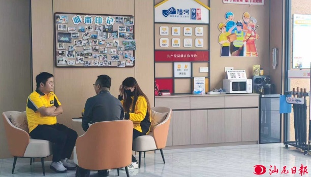 陸河縣城南社區(qū)“暖新驛站”工作人員與新就業(yè)群體面對面交流。