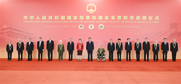 9月29日,中華人民共和國(guó)國(guó)家勛章和國(guó)家榮譽(yù)稱號(hào)頒授儀式在北京人民大會(huì)堂金色大廳隆重舉行。中共中央總書(shū)記、國(guó)家主席、中央軍委主席習(xí)近平向國(guó)家勛章和國(guó)家榮譽(yù)稱號(hào)獲得者頒授勛章獎(jiǎng)?wù)虏l(fā)表重要講話。
