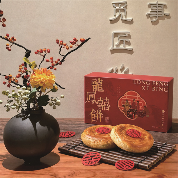 在喜覓瑤元閣的眾多產(chǎn)品中,最讓汕尾老百姓牽掛的莫過于龍鳳喜餅。這餅是汕尾嫁娶儀式里的“硬通貨”,餡料精選杏仁、核桃仁、瓜子仁、光中杏、欖仁等按比例搭配而成的伍仁,咬開滿是堅果油香;餅皮更見功夫,水油酥工藝要經(jīng)過五次折疊、三次醒發(fā),烤好后輕碰即碎,酥皮簌簌落在掌心,卻不沾手。在全新升級的龍鳳禮盒里,伍仁喜餅與雙黃椰絲白蓮蓉喜餅分別象征著五谷豐登與連生貴子。開店至今,瑤元閣已為上萬對新人定制過龍鳳喜餅,不少在外打拼的汕尾人哪怕隔著千里,也要線上訂購,讓“家鄉(xiāng)味”見證自己的婚禮。