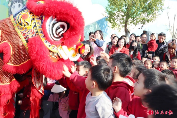 圖為幼兒們與醒獅的互動(dòng)現(xiàn)場。